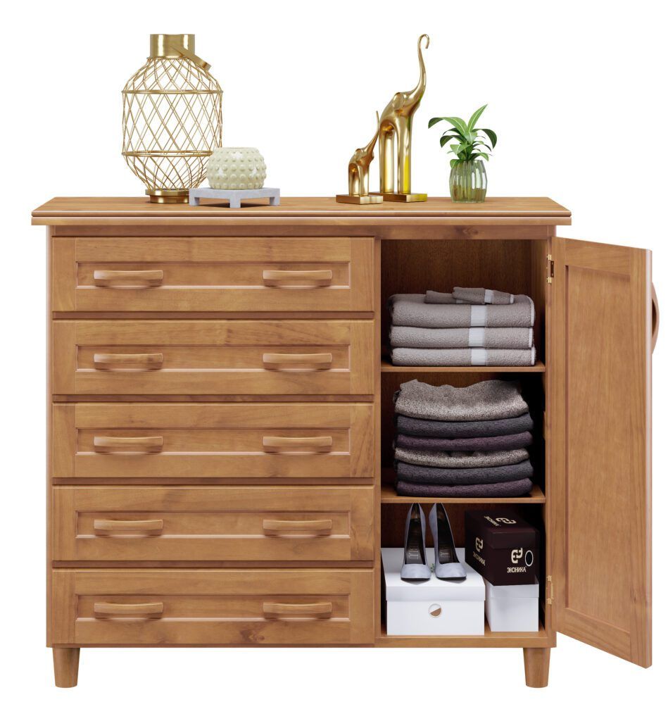 Cômoda multifuncional com design elegante em acabamento amadeirado, ideal para organizar e otimizar o espaço do seu ambiente. Possui 5 gavetas espaçosas com puxadores modernos, além de um compartimento lateral com porta, perfeito para armazenar sapatos ou itens maiores. Estrutura resistente, pés elevados que facilitam a limpeza e estilo versátil que combina com diversos tipos de decoração.