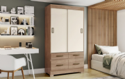 Guarda roupa 2pts deslz 4gav Guarda roupa 2pts deslz 4gav Dimensões aproximadas do produto: Altura: 200,5cm Largura: 109cm Profundidade: 52cm Características: • 02 Portas deslizantes; • 02 Prateleiras; • 04 Gavetas. • Caixa e frente de MDP 1,5 cm. • Puxadores cromados. • Cabideiros resistentes de madeira revestido. • Pés em ABS inclusos. • 04 gavetas externas com corrediças de metal. • Peso máximo 03 Kg por Gavetas. • Peso máximo 08 Kg por Prateleiras. • Peso máximo 08 Kg por Cabide. • Complexidade da montagem Médio. • A indicação de uso é quarto. • Modelo Flex. • Cor Jequitiba Brilho Off White. Obs: Modelo Flex: Roupeiro possui dupla opção de montagem. Cor Jequitiba Brilho/ Off White. Informações complementares: Foto meramente ilustrativa, objetos e decoração não fazem parte do produto. As cores do produto podem variar de acordo com o monitor.