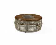- Mesa de Centro Champanheira, produzida em alumínio bege e madeira teka envelhecida com um ar sofisticado para compor o ambiente